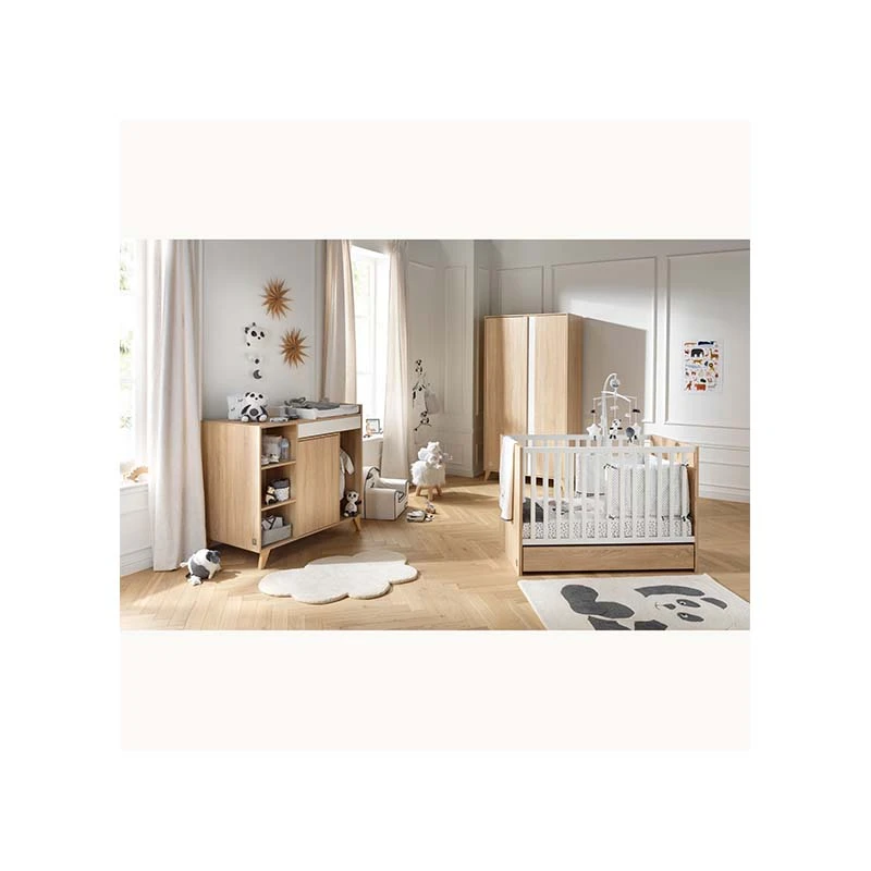 Ses lignes droites, ses pieds obliques et son décor de chêne doré avec une touche de blanc apportent de la douceur à la déco de la chambre de votre bout’chou.