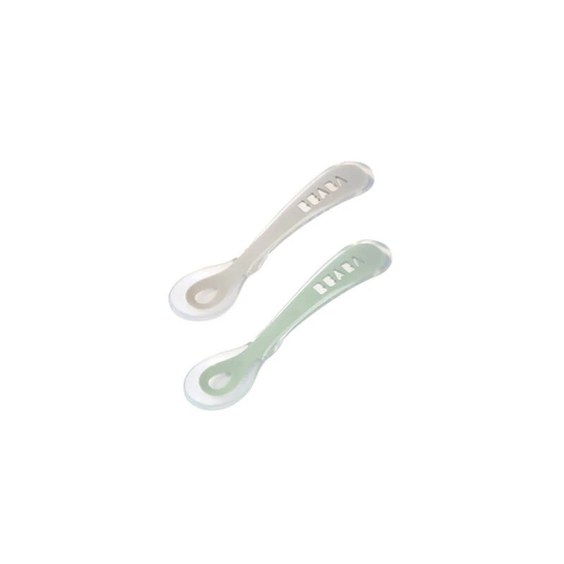 Quelles sont les caractéristiques du lot de 2 cuillères silicone 2ème âge avec boite Vert sauge de Béaba ?