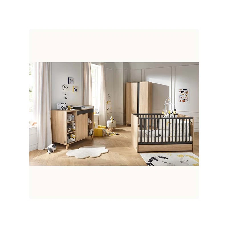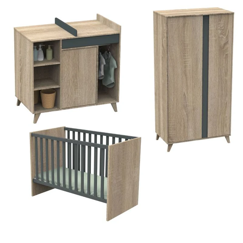 La chambre Nova gris volcan : lit, commode, armoire de la marque Sauthon est un ensemble de 3 meubles et différents accessoires qui permettent d’accueillir bébé dans le confort et la sécurité dès la naissance.