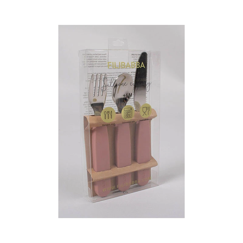 Ce lot de 3 couverts en silicone Filibbaba est conçu pour les enfants et comprend une cuillère, une fourchette et un couteau.