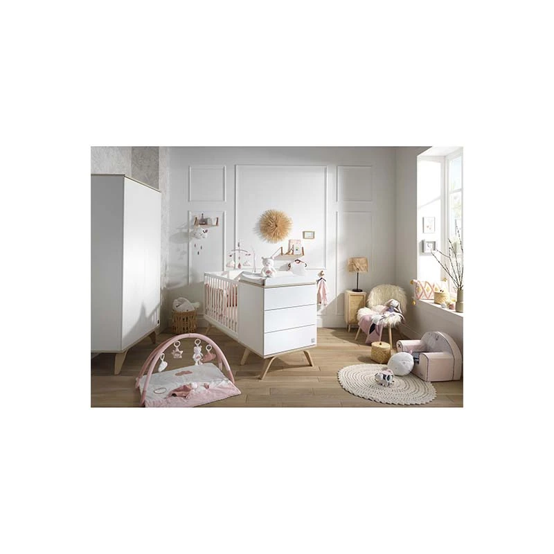 Évolutif, cet ensemble permet de convertir le lit à barreaux en lit junior de 90 x 190 cm (sommier junior vendu séparément) lorsque bébé grandit et la commode peut alors s’utiliser de manière individuelle.