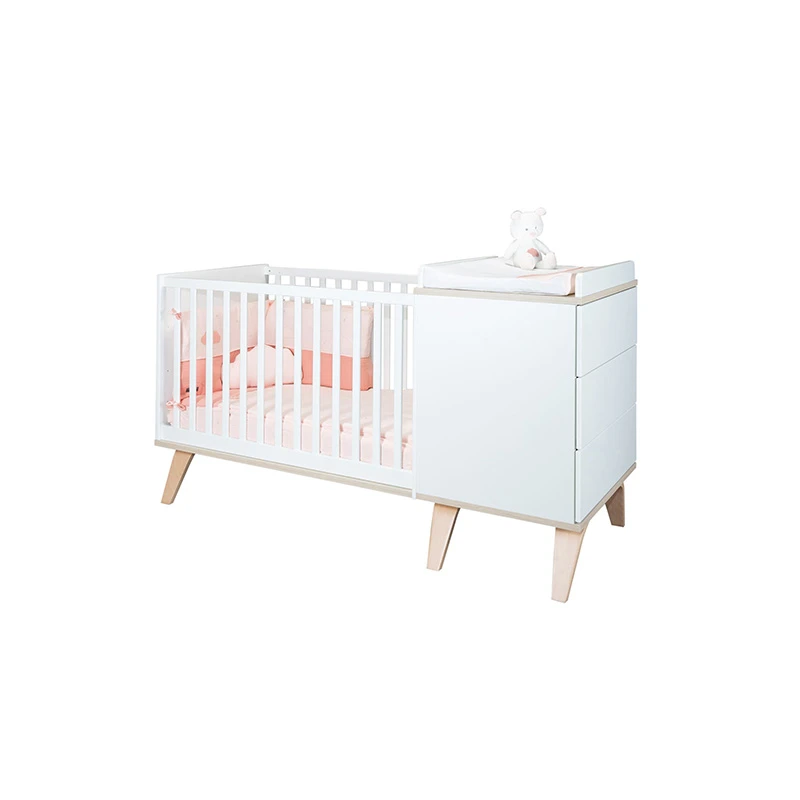 - Le lit combiné évolutif Serena est un meuble compact et polyvalent qui comprend un lit à barreaux et un meuble à langer d’un seul bloc afin de réaliser un véritable gain de place.
