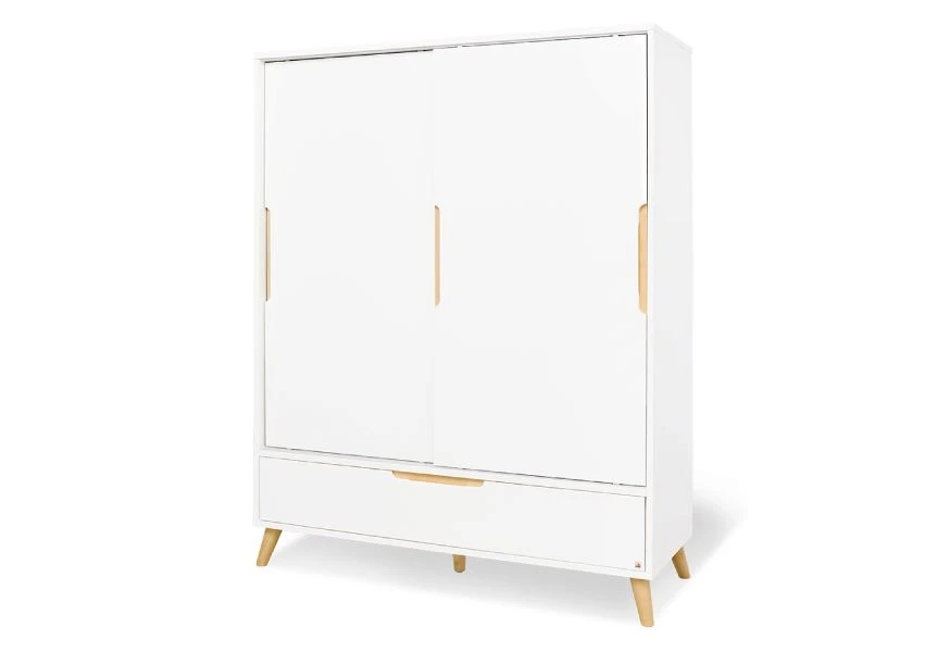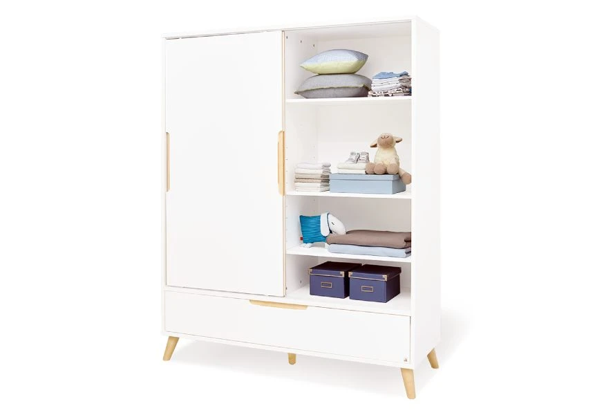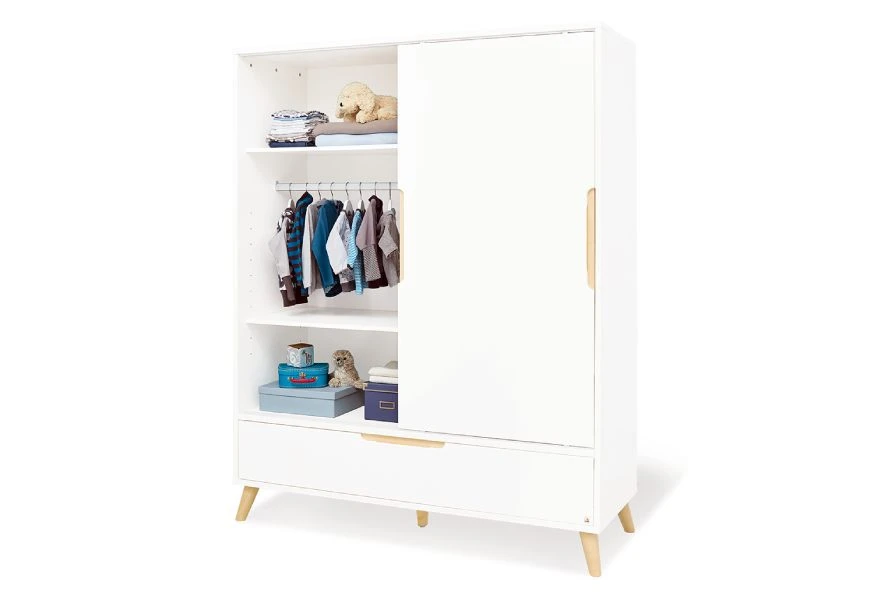 Conçue pour ranger tous les vêtements de bébé, l’armoire Move de Pinolino se compose de 2 portes coulissantes et d’un tiroir avec 2 compartiments.